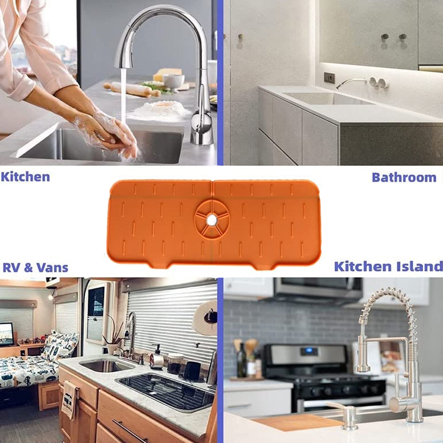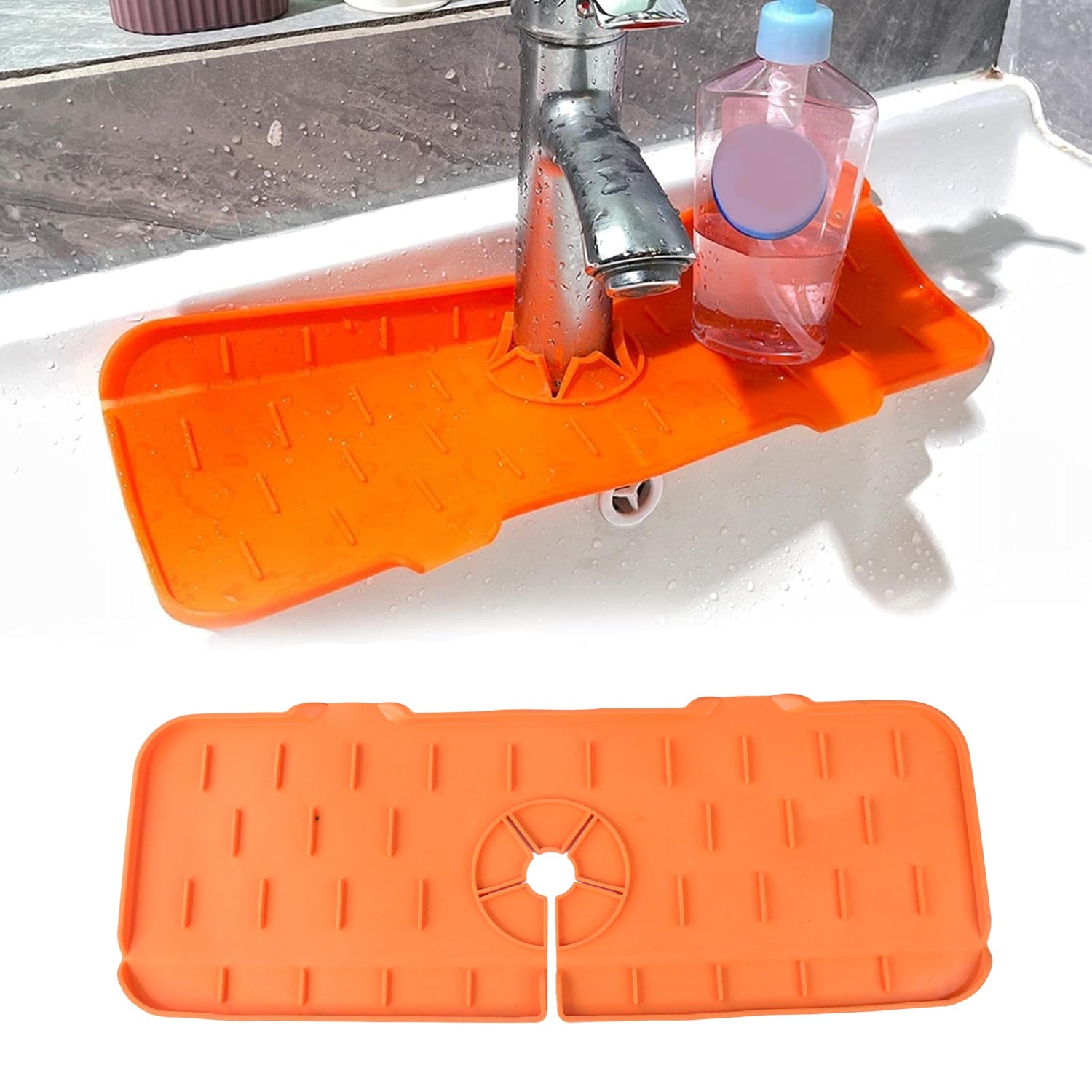 - A sink water splash guard mat specially designed for faucets, the silicone sink faucet splash guard is a labor-saving way to upgrade your kitchen sink. Our silicone faucet splash guard has a raised lip to drain water to the sink. Keep the countertop clean and dry.
