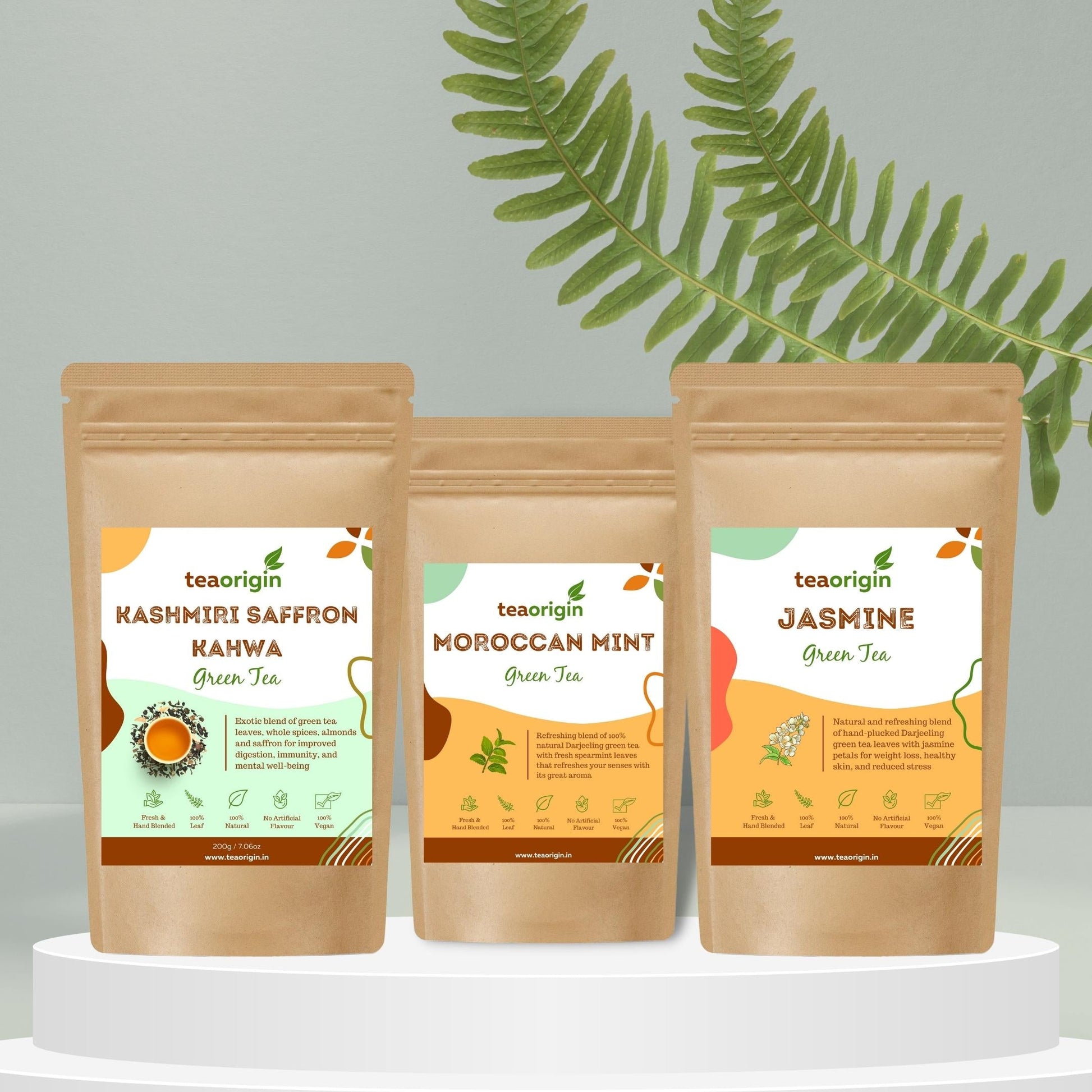 In this Best of Darjeeling Green Tea Combo pack from Tea Origin, you receive Kashmiri Saffron Kahwa Green Tea, Jasmine Green Tea and Moroccan Mint Green Tea.