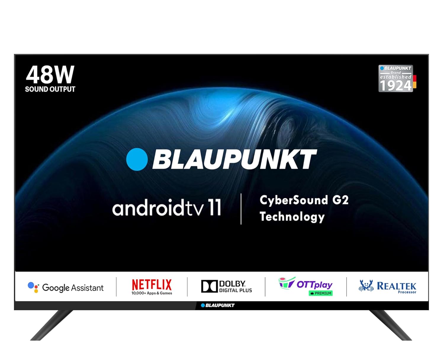 The Blaupunkt Full HD TV runs on Android 11, giving you access to your favorite movies, shows, games, and apps. With a Realtek processor, 1GB RAM, and 8GB ROM, this TV ensures smooth performance, while dual-band Wi-Fi provides fast connectivity for endless entertainment. The built-in Google Assistant allows voice control for easy content search. Enjoy cinematic audio with 48W sound output and Dolby Digital Plus technology. Its bezel-less design offers a more immersive viewing experience, and the smart remote provides quick access to apps like Netflix, YouTube, and Disney+Hotstar for added convenience.