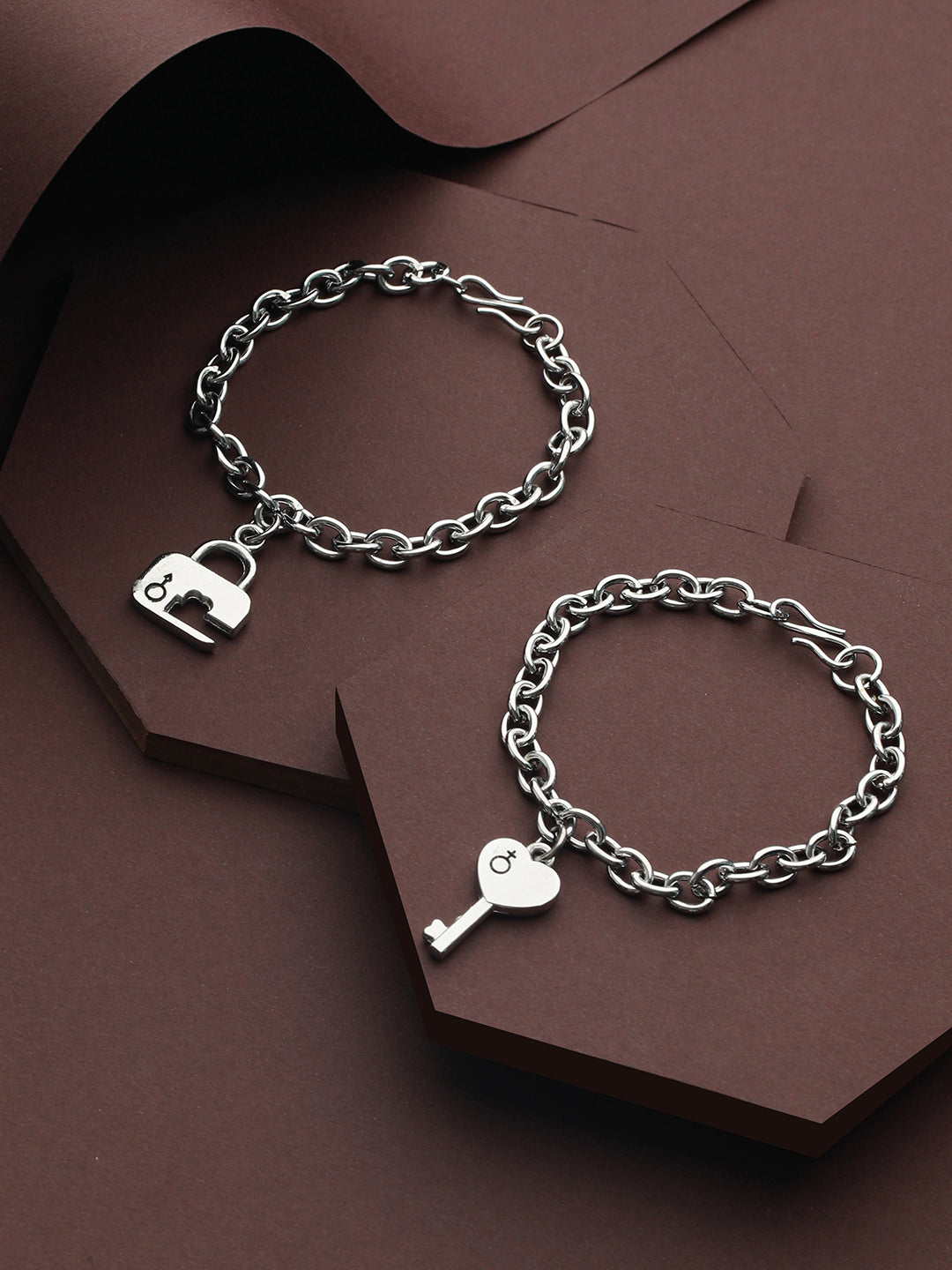 This set of couple bracelets is great for expressing affection to your loved one. It has a link chain design with a tiny lock attached to one and a heart-like key to that lock in the other one.