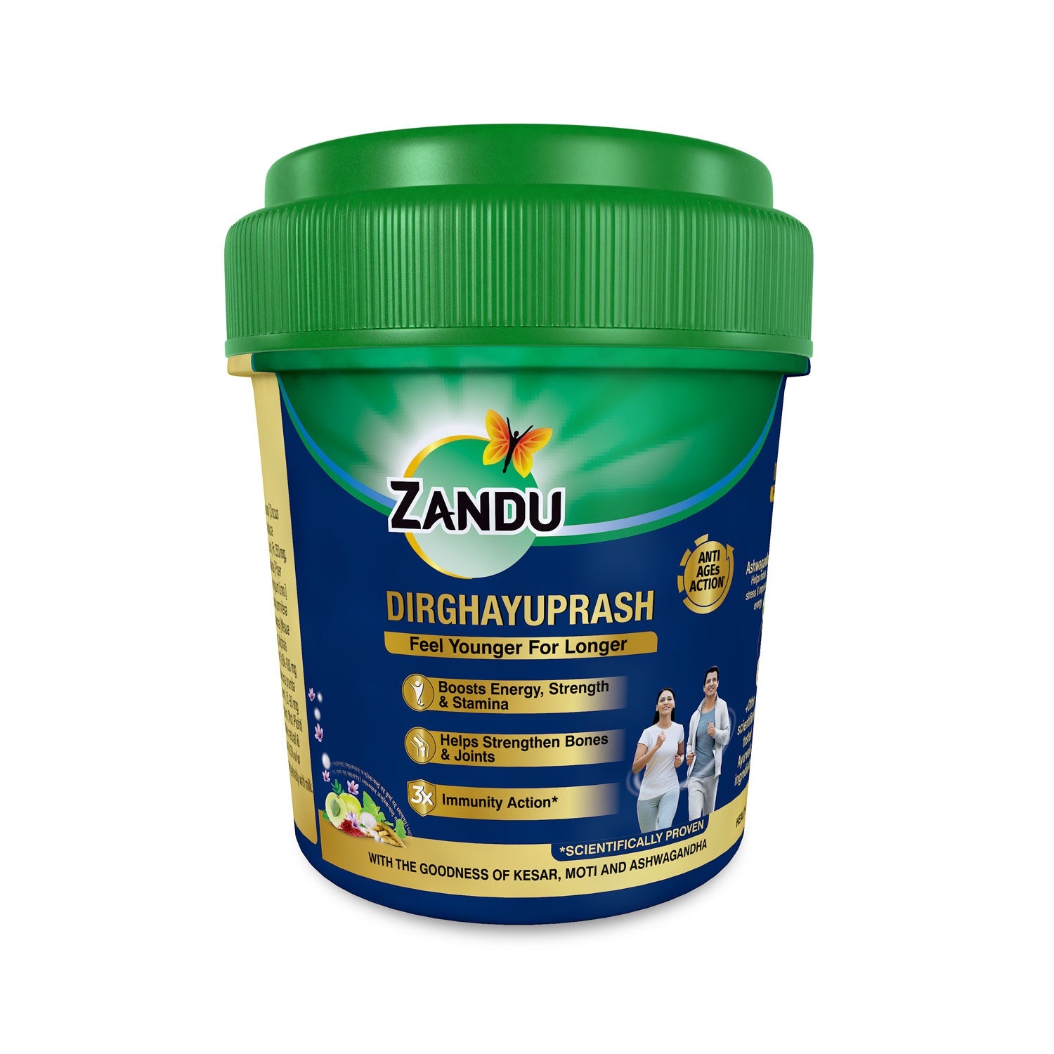 Dirghayuprash takes a comprehensive approach to well-being by targeting the root causes of ageing. Zandu Dirghayuprash, a revolutionary Ayurvedic blend, offers a dual approach to aging. It combines the immunity-boosting power of Chyawanprash with the anti-aging benefits of Vayah-sthapan Mahakashaya ingredients.
