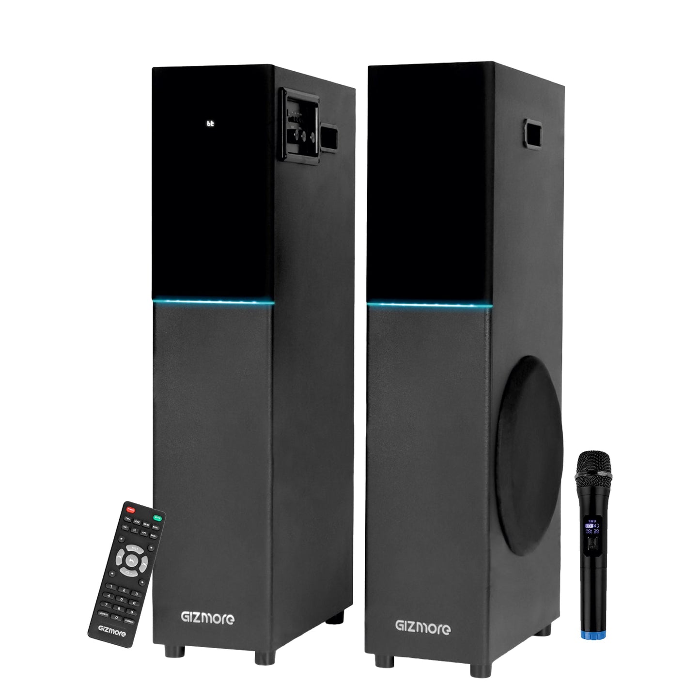 Elevate your parties with the GIZMORE DT11500 dual tower speaker, designed to blast your favorite tunes with high-power output and stylish design. Perfect for karaoke enthusiasts, these speakers come with a UHF wireless mic and Bluetooth compatibility, making singing along a breeze. Enjoy seamless connection via Bluetooth, FM, AUX, or USB, catering to all your playback needs. The 120W speaker delivers powerful bass and clear trebles for an unmatched audio experience. Control is easy with a digital LED display and remote, while vibrant RGB lights add a fun, sophisticated vibe to your space. Whether for loud parties or singing practice, these speakers ensure high fidelity sound at any volume.
