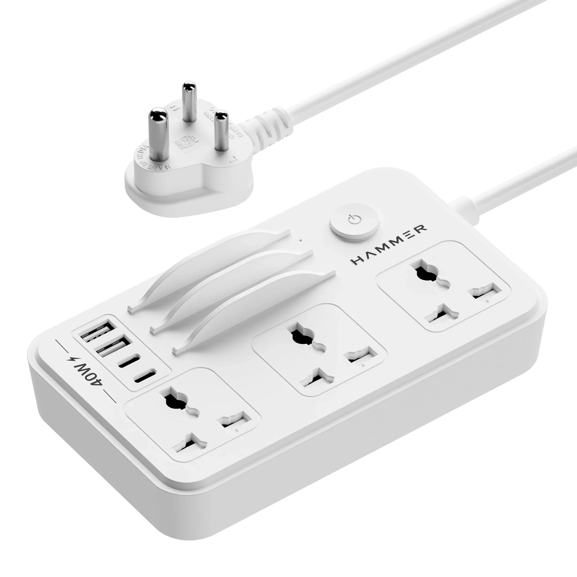 HAMMER Power Strip with 3 Universal Sockets with Child Security, 2 USB Ports and 2 Type C 20w PD, Mobile Holder, 2300W with 1.5 Meter Cable White