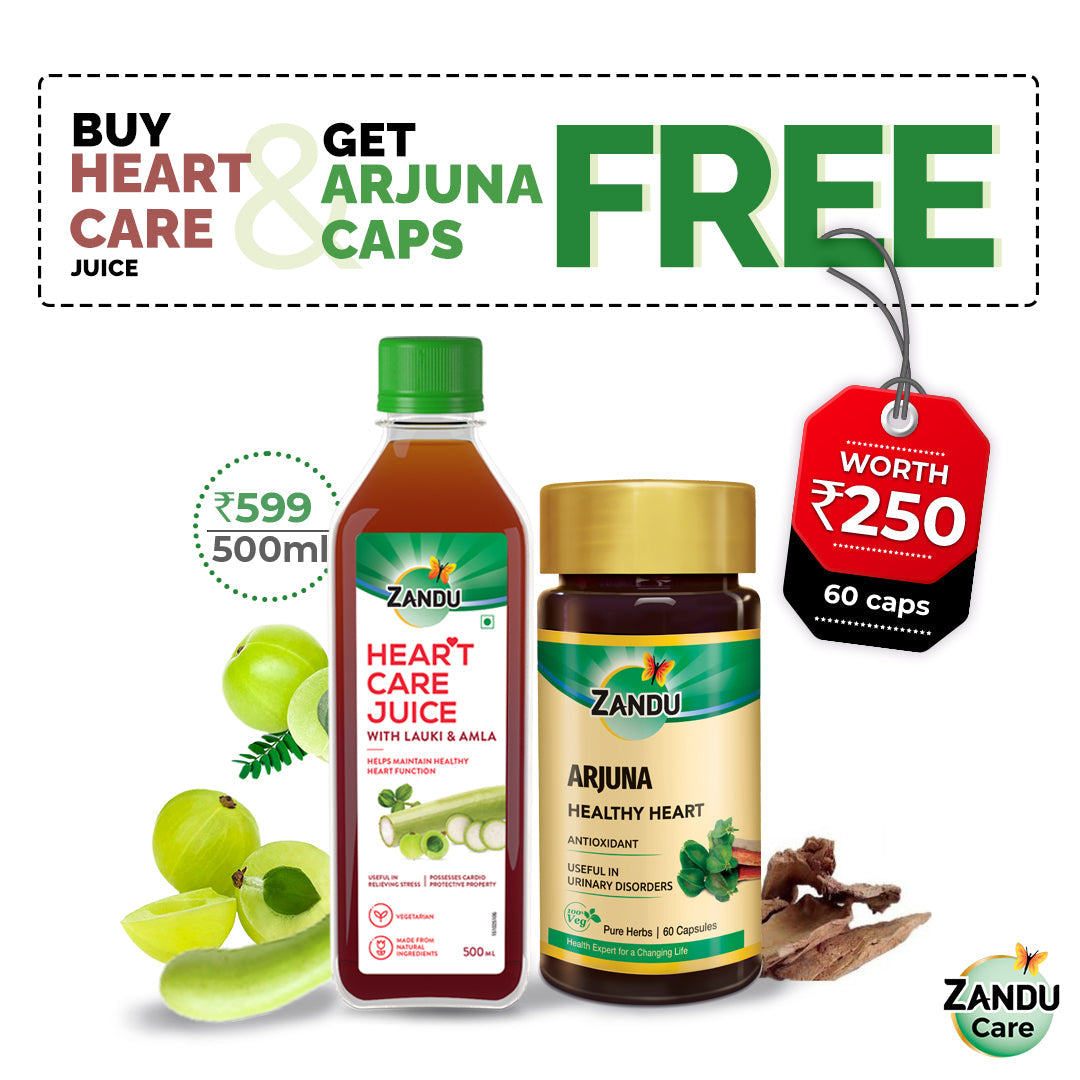 Zandu Hear??t Care Juice is formulated using extracts of Arjuna, Lauki and Amla. Ingredients are blended, pasteurized, and packed in the form of juice that is quick and easy to consume on the go or at work. This Ayurvedic juice offers a variety of health benefits to modern consumers. It helps maintain healthy heart function, minimizing the risk of heart ailments. Besides, it is also useful in preventing stress and possesses cardio protective properties. Other benefits of this Arjuna, Lauki and Amla juice include strengthening heart muscles, maintaining healthy lipid levels and boosting immunity. As booster juices become popular with the pandemic, our range of Wellness Juices is designed to fill the gap in the market for solutions that offer Ayurvedic benefits from a reputed source. This Heart Care Juice of Arjuna, Amla and Lauki is meant to become your long-term fitness partner, promising a healthy life and a happy outlook. It delivers the true wellness of Ayurveda without compromising on taste or convenience.