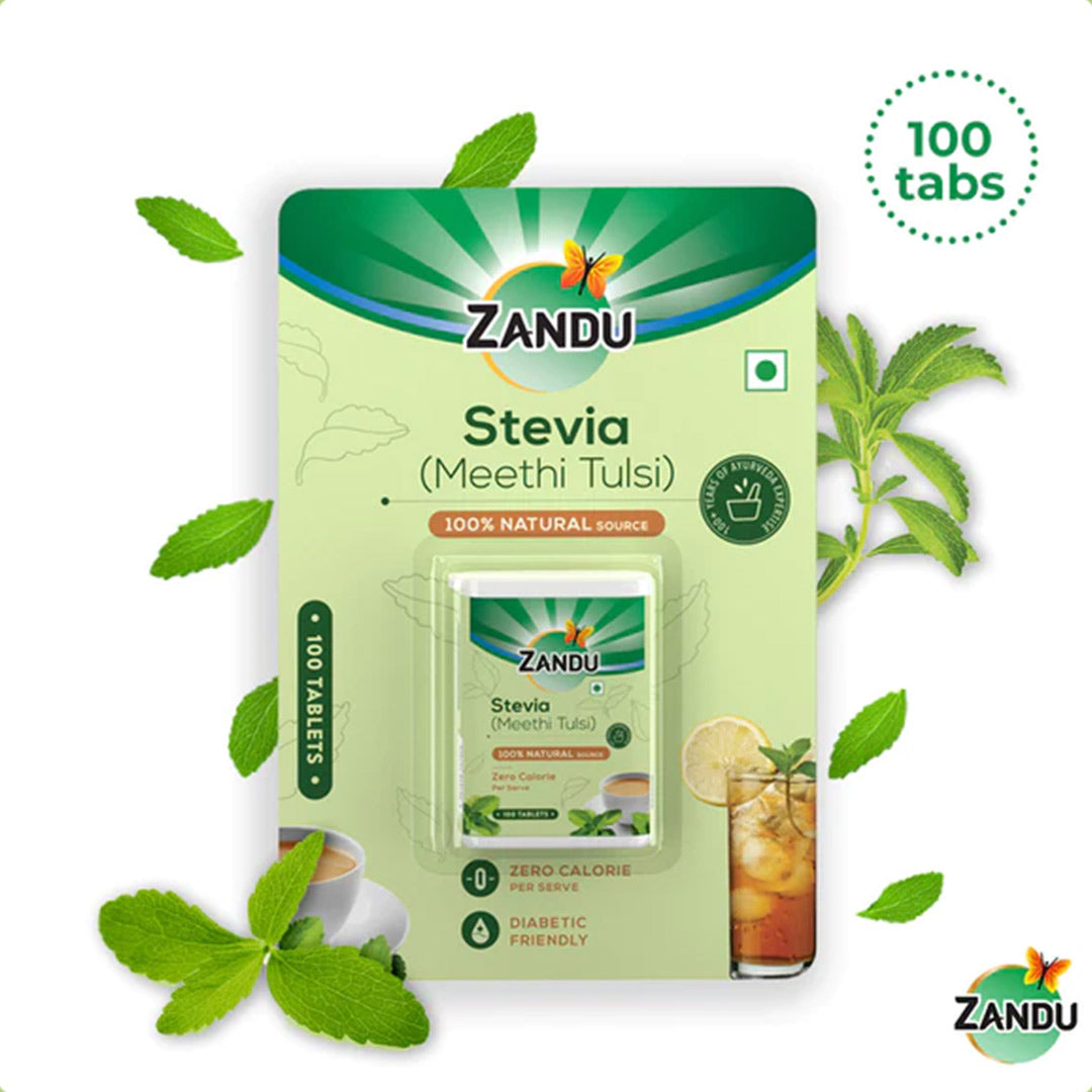As we move towards maintaining wellness rather than treating illness, reducing the sugar intake has become crucial in achieving our wellness goals. At Zandu, we understand this and have brought Zandu Stevia (Meethi Tulsi) tablets prepared from Stevia extract, a 100% natural source to offer valuable health benefits. With Zandu products, you can be sure of opting for more than 100 years of trust and quality. Zandu Foundation for Health Care was the first to cultivate Stevia in India. Zandu Stevia is a diabetic-friendly product that is safe to consume. These tablets contain no added preservatives, no artificial colours or flavours and offer zero calories per serve. Stevia leaves are a globally approved source of natural sweetening, which delivers similar sweetness as regular sugar without compromising taste. These sweetener tablets help maintain healthy sugar levels & healthy weight. Its low glycaemic index makes it suitable for people who want to reduce their sugar intake or avoid it. Keeping the convenience of our consumers in mind, we have created these tablets in an easy to consume form, and you can replace regular sugar with Zandu Stevia in your hot and cold beverages at any time of the day. The ongoing pandemic has made us opt for healthier alternatives in our diet. Prepared from a 100% natural source, these Stevia tablets are an easy, healthy and safe sugar alternative, giving you the same sweetness without any worry. Now consume your favourite beverages sweetened with Stevia and experience nature’s gift of sweetness with time-less health benefits.