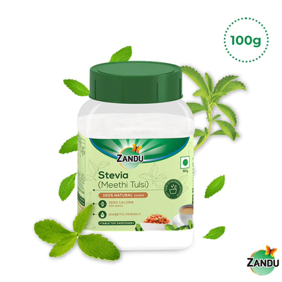 Human have always relied on nature for valuable benefits from plants. Our relationship with nature has always brought us nourishment and healing. As the world moves towards a healthier way of life, cutting down excess sugar is on everybody’s mind. A safe, natural and healthy way of doing it is by substituting sugar with Stevia powder. This natural sugar alternative is globally approved as a sweetener. Zandu Stevia (Meethi Tulsi) Powder is prepared from Stevia extract, a 100% natural source, and offers time-tested health benefits in a convenient form. With Zandu products, you can be assured of opting for more than 100 years of quality and trust. Zandu Foundation for Health Care was the first to cultivate Stevia in India. Zandu Stevia is diabetic friendly, and regular substitution of sugar from your diet with this Stevia powder can help you maintain healthy sugar levels and be a companion in your wellness journey. It can easily replace sugar in your cakes, sweets, desserts, hot and cold beverages like coffee, tea, milk and juices. It offers zero carbohydrates & calories per serve, contains no preservatives, artificial colours or flavours and is absolutely safe for consumption. Today, we all have started to opt for healthier alternatives in our diets and lifestyles. Zandu Stevia is the perfect solution to one of the biggest concerns with modern eating habits - excess sugar. If you’re looking to get healthy, Zandu Stevia (Meethi Tulsi) Powder is a good place to start.