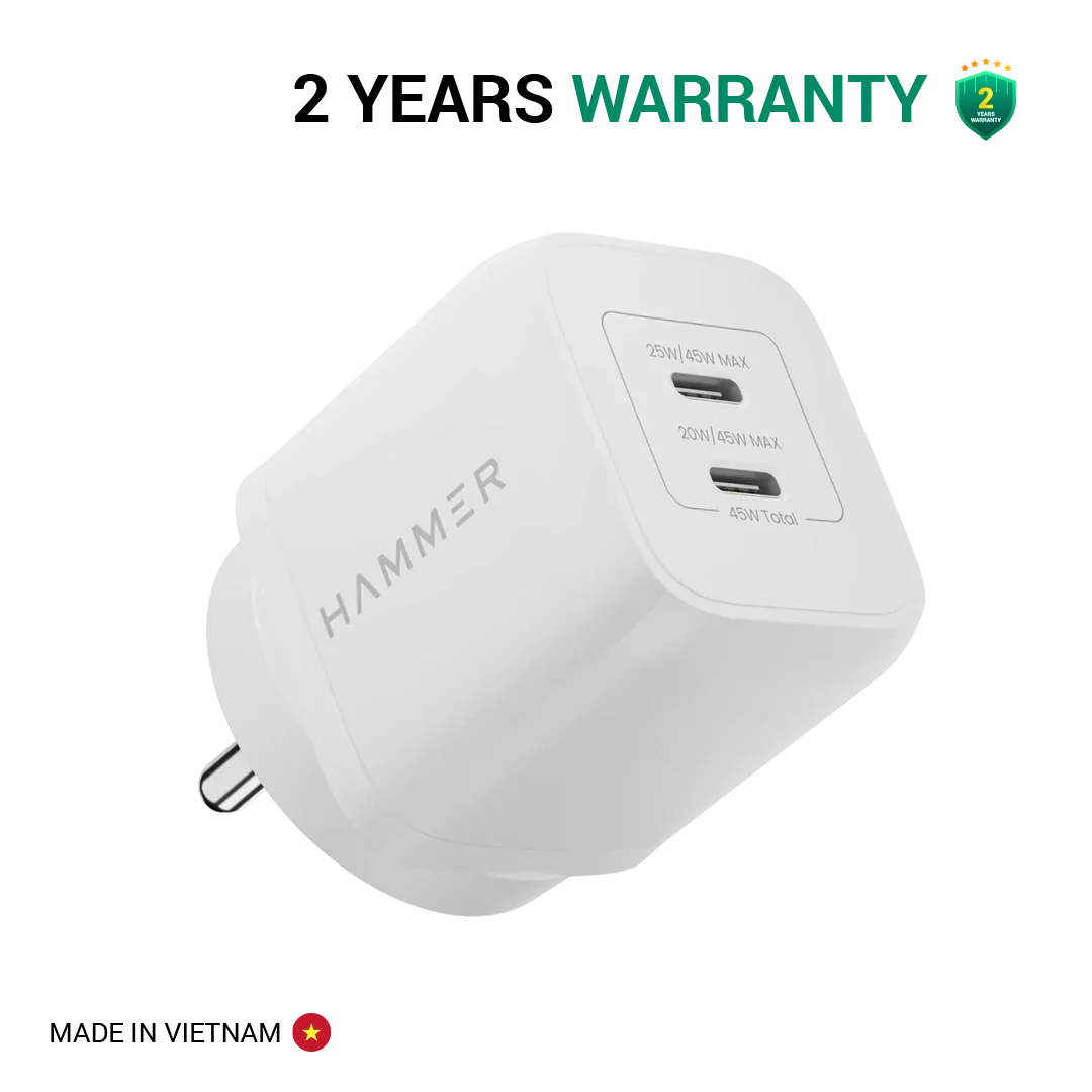 Experience the ultimate charging solution with the Hammer 45W GaN Charger. Equipped with dual ports Type C, this charger doubles your charging capacity, efficiently distributing 25W in USB-C port 1 and 20W in USB-C port 2 when used simultaneously. Its compact size belies its powerful performance, delivering a maximum wattage of 45W per port, thanks to its advanced GaN technology. Safety is paramount with its suite of advanced protection features, including over current, overload, over voltage, short circuit, and overheat protection, ensuring the safety and longevity of your devices. With supercharged capabilities, and PD 3.0 technology, this adapter can charge an iPhone15 to 50% in just 30 minutes, keeping you connected throughout the day. Widely compatible with smartphones, laptops, tablets, and more, it reduces charging time across devices. Plus, with a standard 1-year warranty and an additional 1-year extended warranty, you can enjoy peace of mind and trust in every purchase.