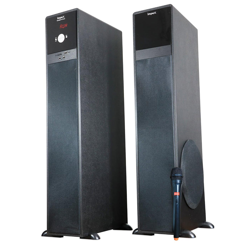 The Impex 2 channel tower speakers are a perfect option if you love to listen to loud and pulsating music. It comes with a wireless mic and a karaoke function. This speaker set with mic helps in making a fun evening with friends. The 80 watts PMPO output provides the loudest music experience ever.
