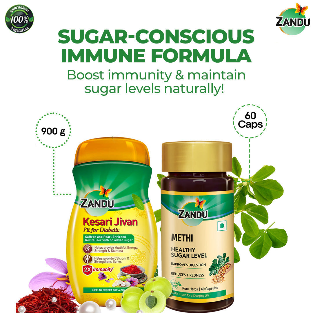 Zandu Kesari Jivan - FFD is specially formulated for those with high blood sugar levels. This daily revitalizer, enriched with saffron and pearl, gives you required power and helps promote youthful energy. Regular use improves calcium levels in the body thereby strengthening the bones. It'll keep you energetic throughout the day.