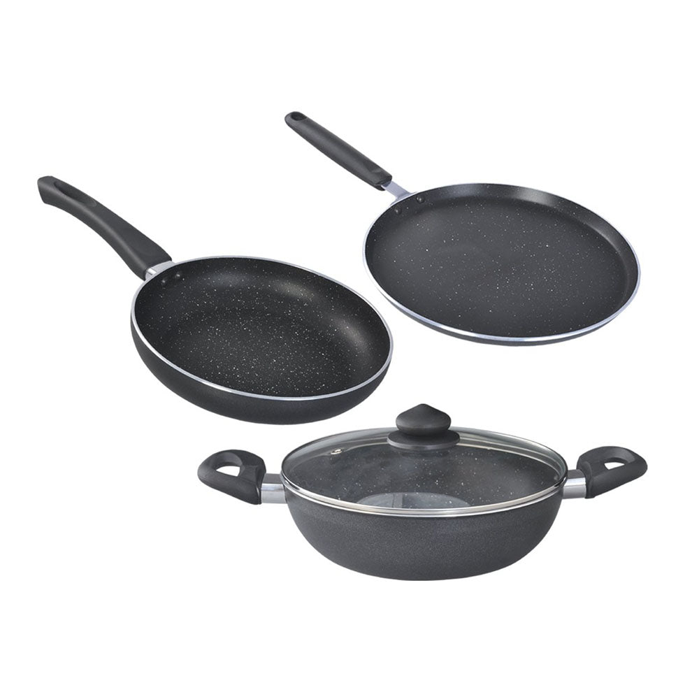 - Package contents: 1-Piece Fry Pan (24cm), 1-Piece Omni Tawa (25cm), 1-Piece Kadai with Lid (24cm)