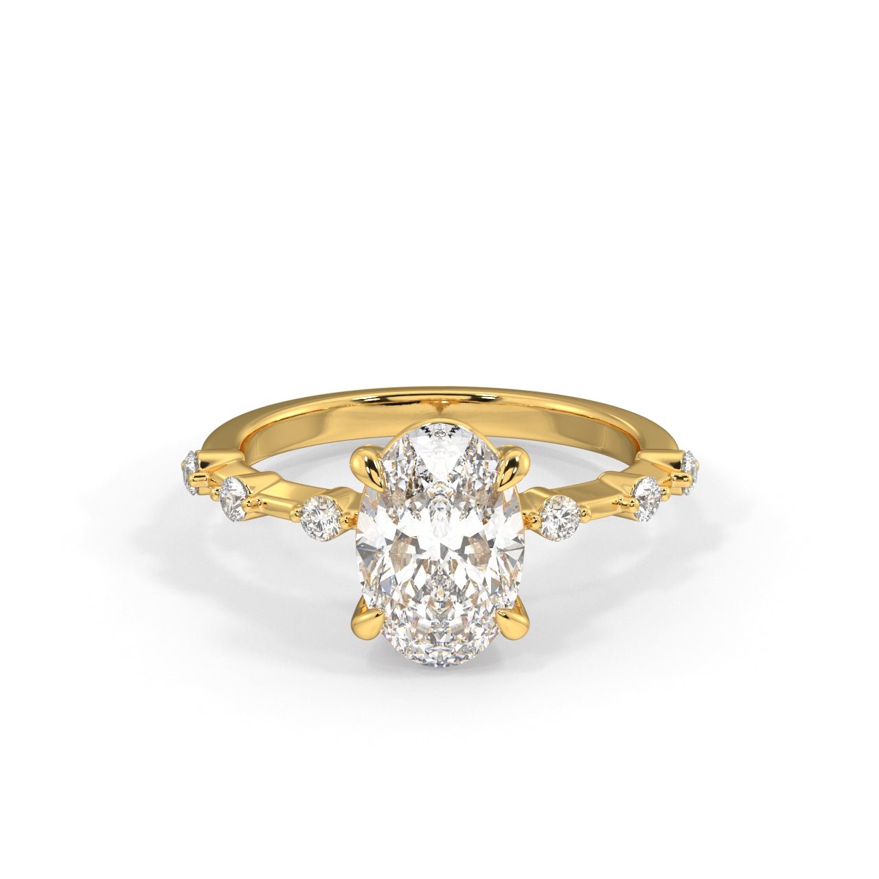 "Radiant Reverie" ring captivates with an exquisite oval-cut diamond adorned by delicate accent diamonds, exuding elegance and grace. Featuring claw prongs that lend a sleek and chic aesthetic, this dainty piece embodies sophistication and refinement. Perfect for those who appreciate understated beauty, this ring is a timeless addition to any jewelry collection, adding a touch of sparkle to any ensemble.