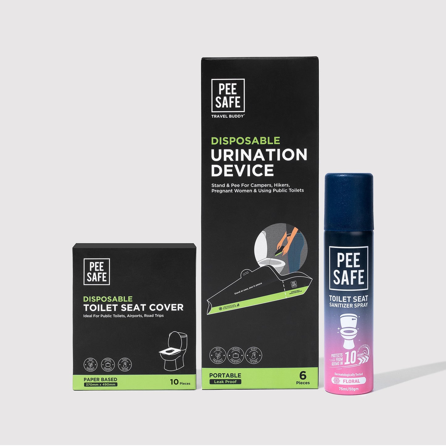 Protect yourself from germs with the Toilet Seat Sanitizer which eliminates 99.9% of surface bacteria. For added hygiene, use our Disposable Toilet Seat Covers, offering protection from UTIs and infections in public restrooms. Complete your kit with the Travel Buddy Urination Device, allowing you to stand and pee hygienically in any situation. Stay safe and comfortable wherever your adventures take you!