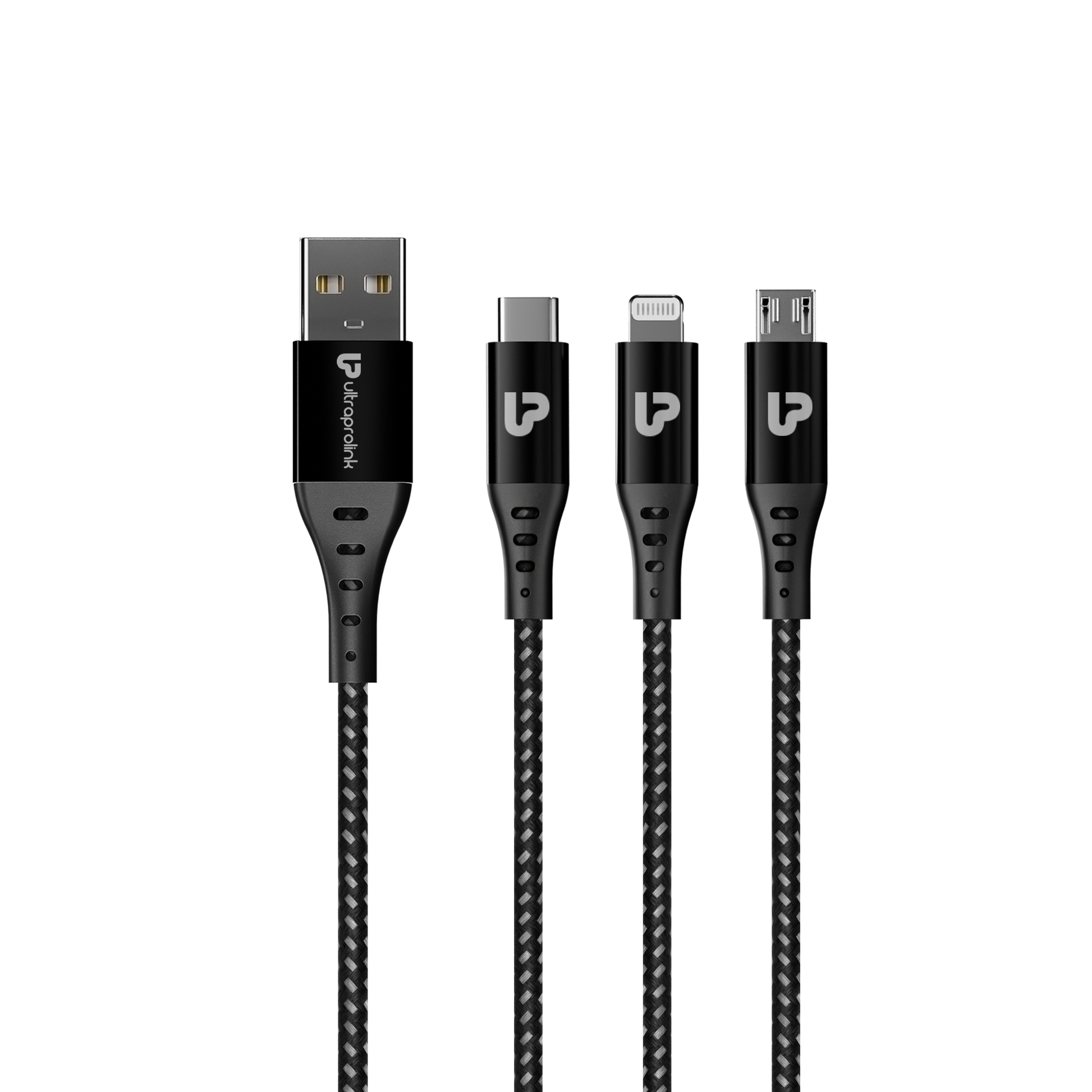 UltraProlink TrioLink 18W 3 in 1 fast charging cable for a rapid charge experience. With its high capability of charging several devices comfortably at the same time when traveling, at home, or at the workplace, the 3-in-1 Charging Cable offers the user a fresh, innovative, and high-quality charging experience. This product is equipped with a Micro USB, iPhone cable and Type c connector compatible with almost any device and is specifically designed and dedicated for charging. The cable is braided with premium nylon fibre which lasts longer than common rubber or textile coating. Its tough outer flexible design offers the user a tangle-free experience. You now have access to a quick, dependable, and convenient source of lightning fast charging on the road thanks to this new versatile, portable, and resourceful solution.
